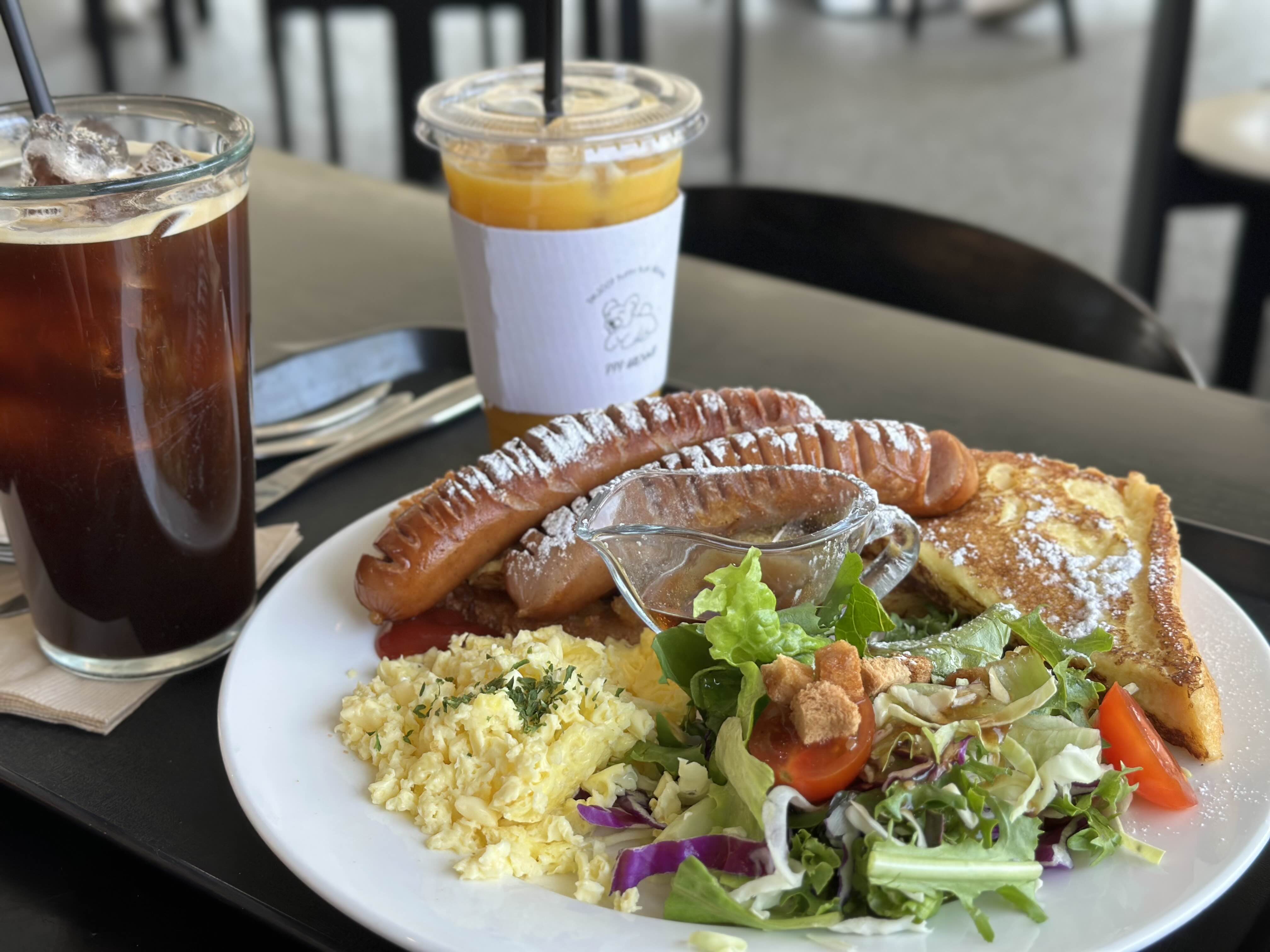 프렌치토스트, 소시지, 감자튀김, 달걀 스크램블 등
