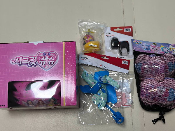 사은품으로 시크릿 쥬쥬 헬멧, 팔 무릎 보호대, 바람개비, 러버덕 라이트, 바람개비, 앞뒤 전조등, 펌프가 왔어요.