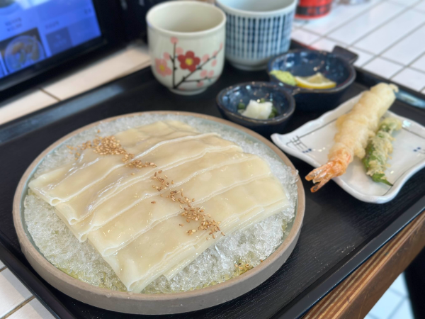 얼음위에 면이 올라가있어 차갑게 먹는 요리이다.