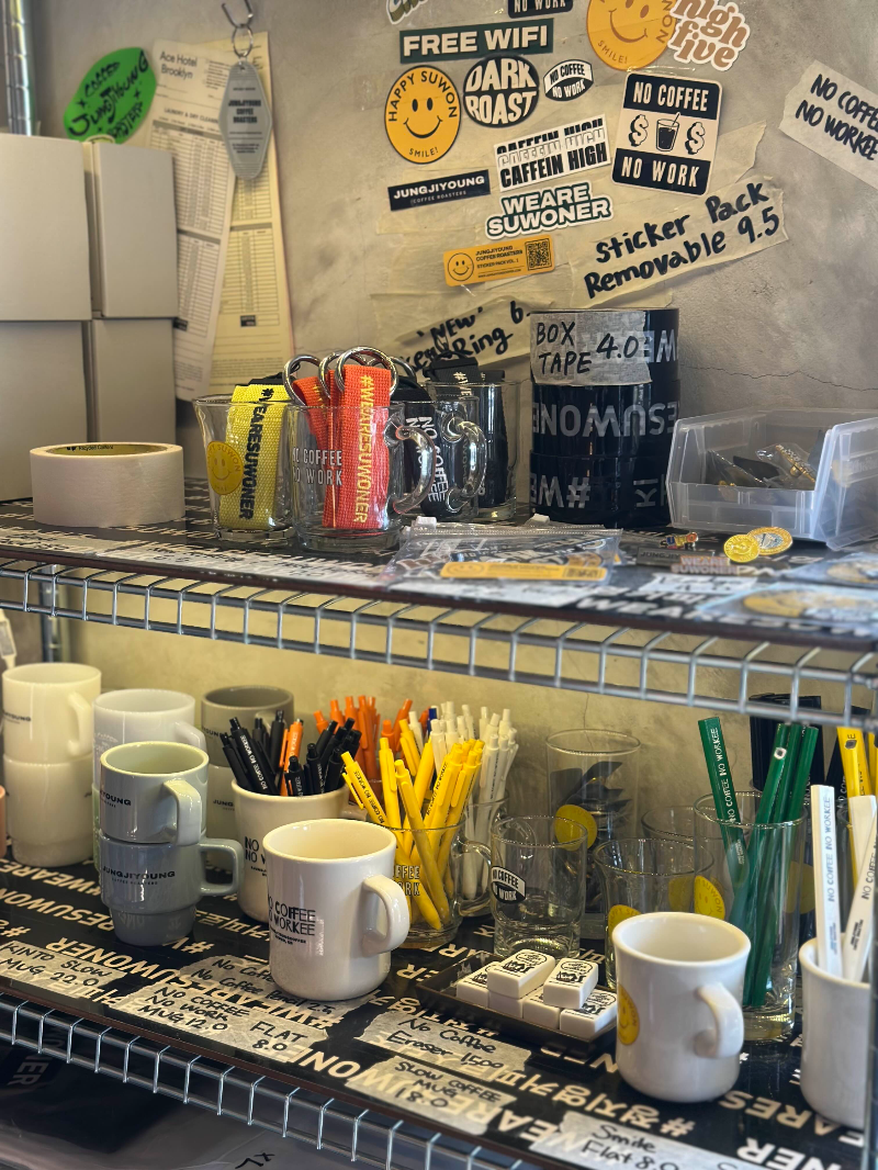 디저트류 뒤쪽에는 컵, 펜 등의 상품들이 보였다.